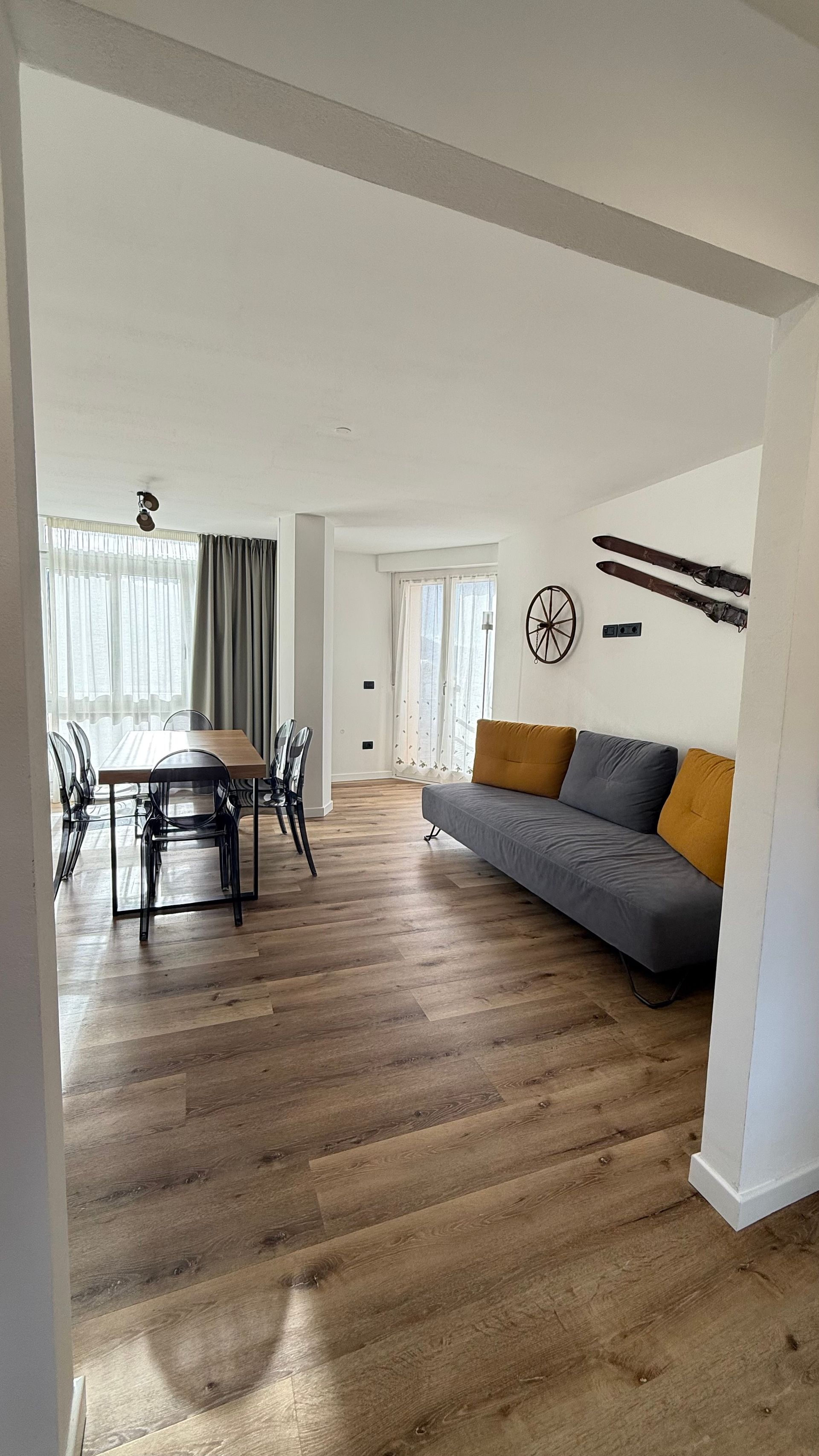 La mansarda, luminosa e ariosa, si trova al piano superiore di una costruzione tipica di montagna e gode di splendide viste panoramiche sulle montagne circostanti.