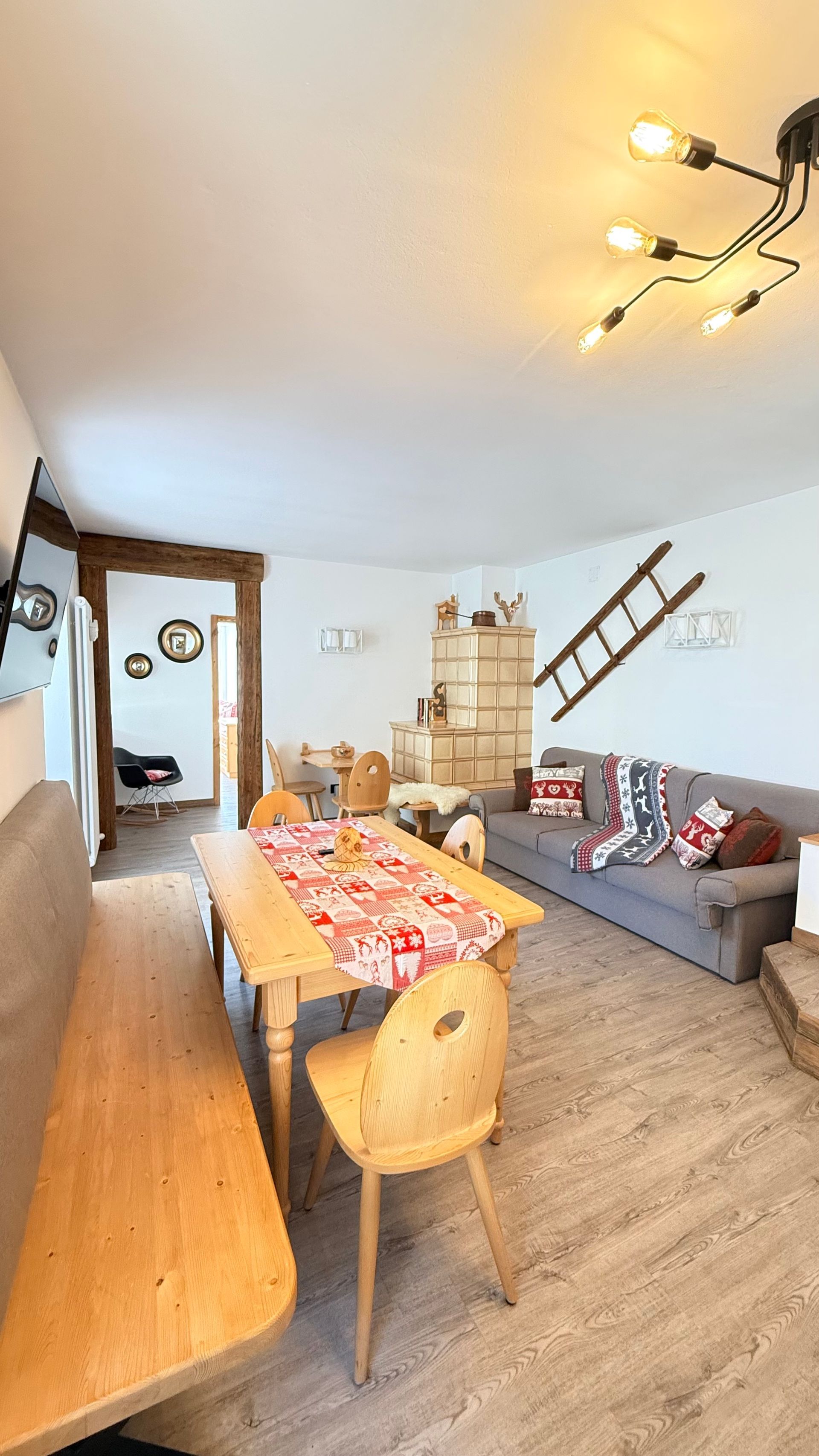 Accogliente mansarda in tipico stile alpino, caratterizzata da caldi rivestimenti in legno che avvolgono pavimento e soffitto creando un’atmosfera intima e rilassante. Le travi a vista e il tetto spiovente donano charme e autenticità all’ambiente.