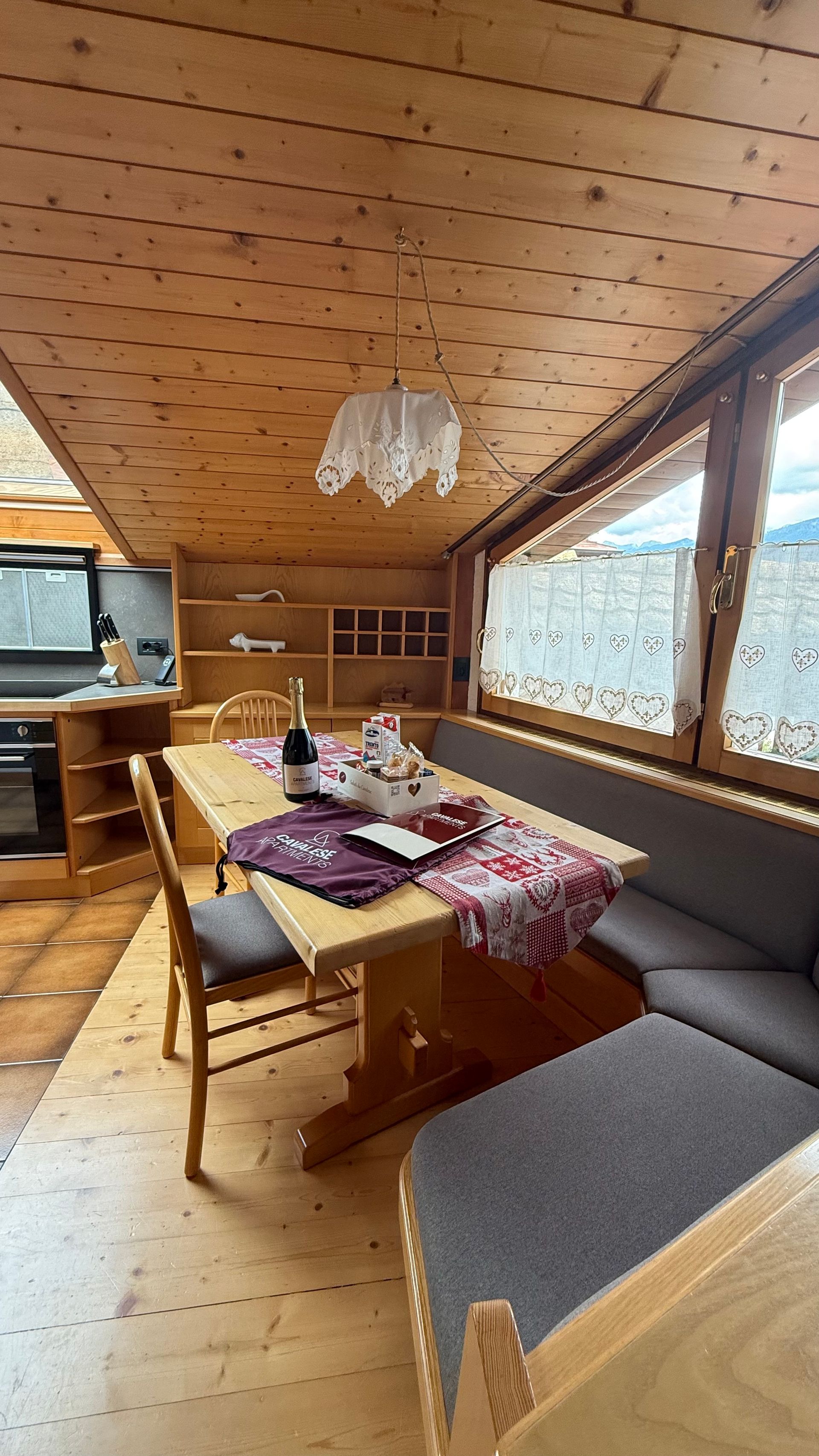 Ampia cucina arredata con il tipico tavolo con panca, affaccia sul terrazzo incastonato sui tetti, arredato anch'esso con tavolo e sedie. L'ampio Velux rende luminosa la stanza ed offre una vista meravigliosa sul campanile della Chiesa di San Sebastiano. La cucina è dotata di piano ad induzione, forno a microonde, forno, lavastoviglie e Nespresso. Pentole WMF e stoviglie Villeroy&Boch.